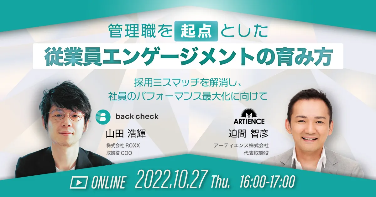 モデレーターは、オンラインリファレンスチェックサービス年間実施数No.1の「back check」を運営する弊社 取締役COOの山田、 そしてスピーカーは、顧客との共創・協働を大切にして研修サービスを提供する、アーティエンス株式会社から迫間氏をお招きいたします。